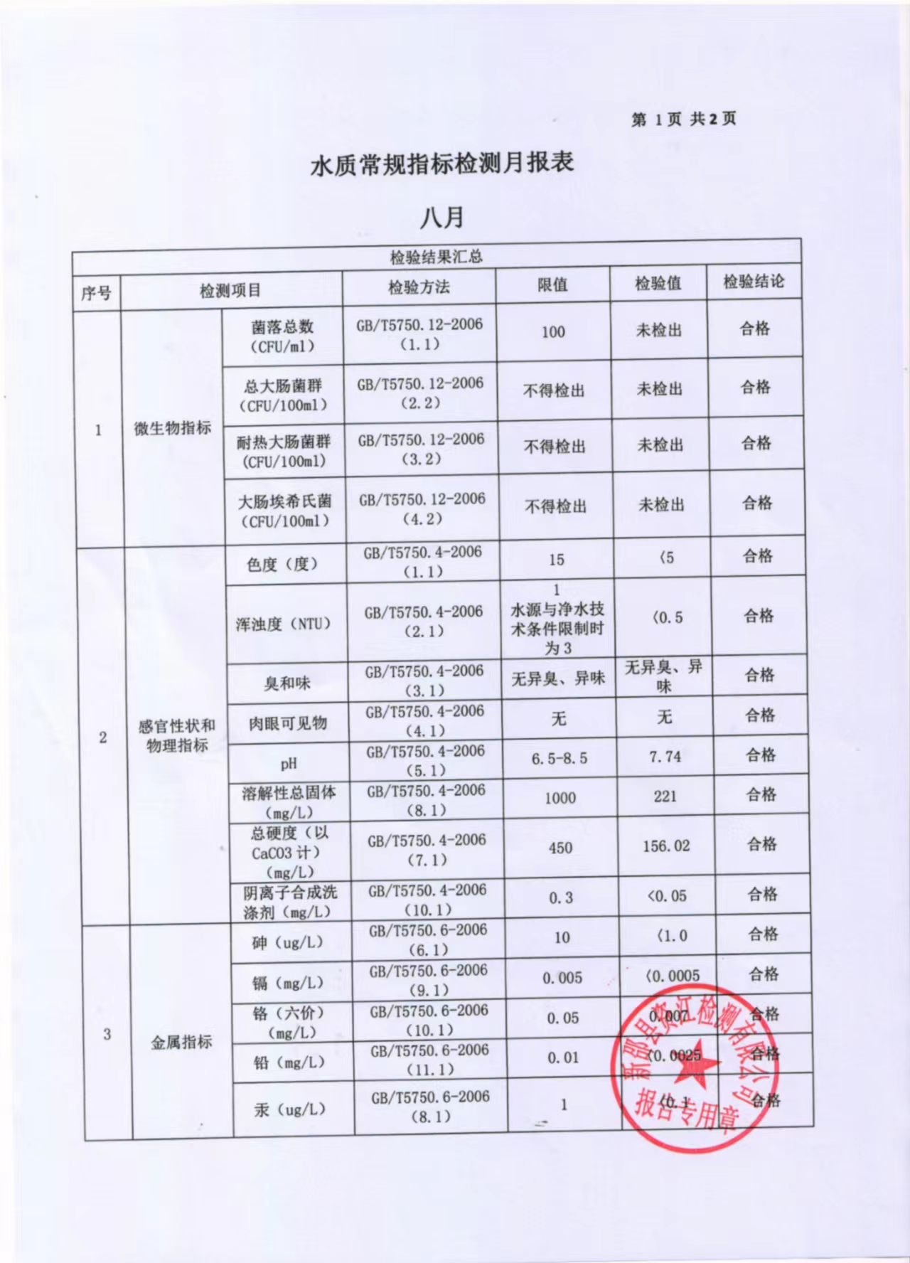 2023年8月水质报表